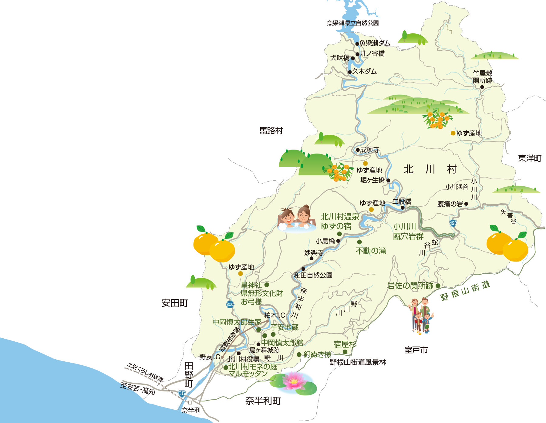 北川村を観光する際に活用できるのが、「北川村村営バス」です。ごめん・なはり線の奈半利駅を起点に、1時間に1本程度、観光地である北川村「モネの庭」マルモッタン(230円)や、「中岡慎太郎館(柏木)」(300円)に乗り入れています。