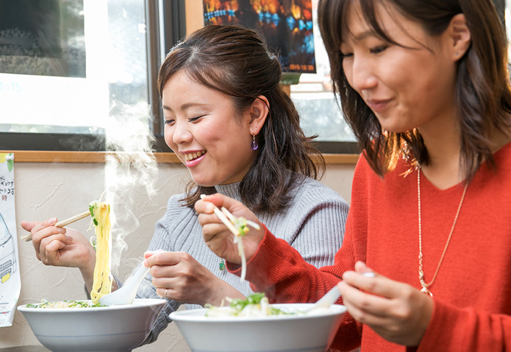 メニューの中から塩ラーメンと醤油ラーメン(共に850円)を注文。何より驚いたのは、一杯のラーメンにモヤシ一袋がまるまる使われるなんて…。おまけにネギもタップリ。その下にはチャーシューがずらっと並んでいました。麺が隠れるほどのボリュームです。さらに、この店オリジナルと教えてもらった、青唐辛子入り柚子コショウを使ってみると、おいしさがパワーアップして見事に完食。ごちそうさまでした。