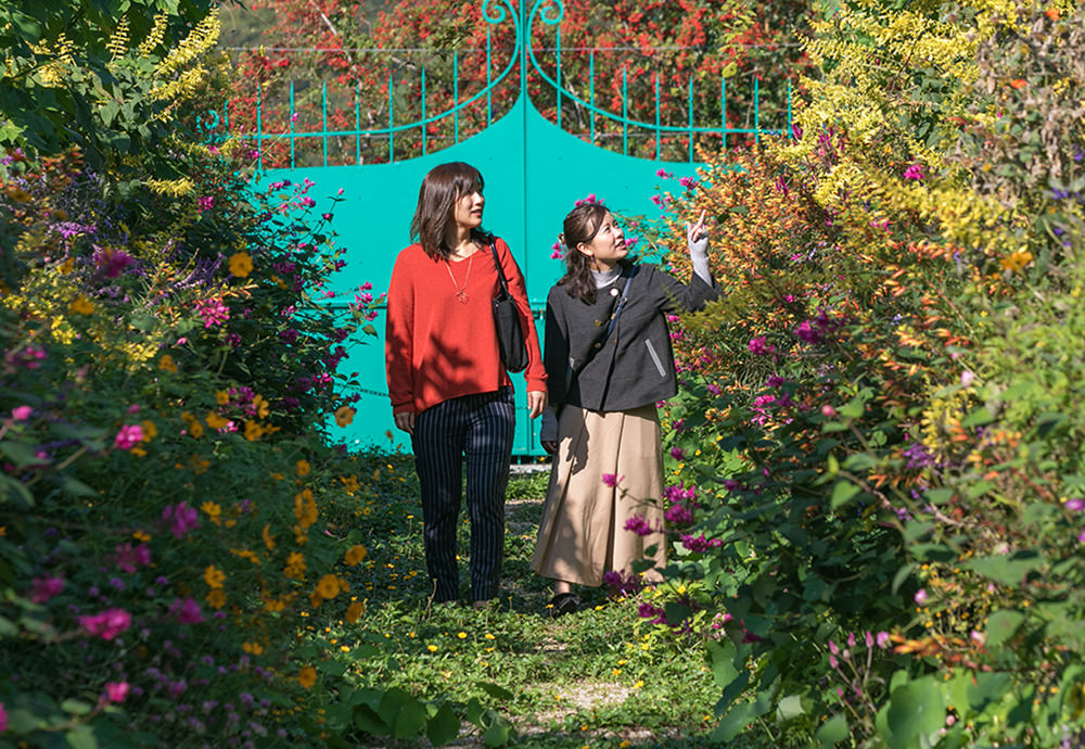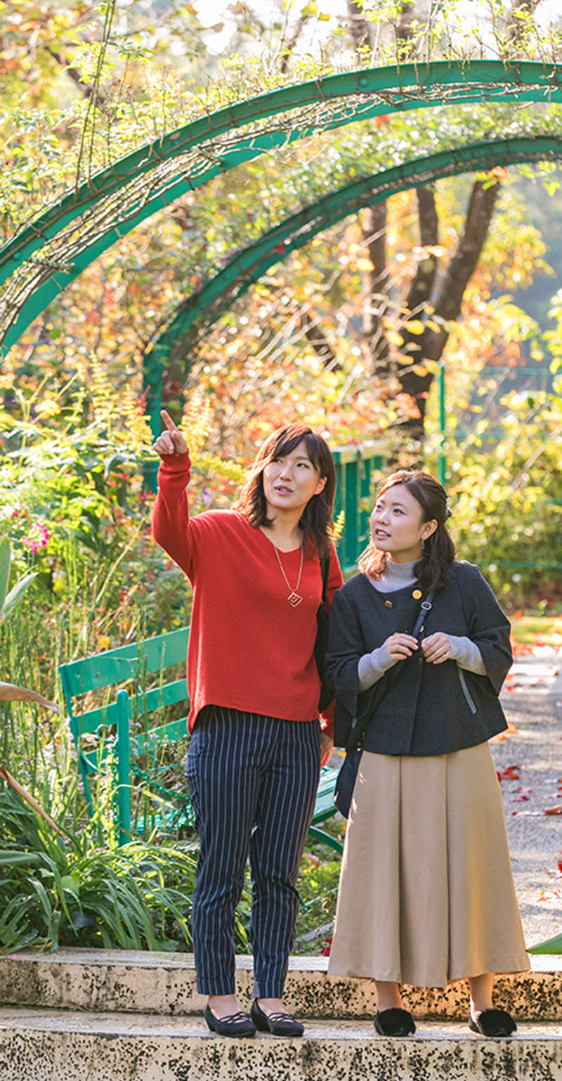 のどかな風景を眺めながら進んで、北川村「モネの庭」マルモッタンの入口に到着です。なんだかワクワクしてきました。 ここは、印象派の巨匠クロード・モネの愛した風景を再現した場所で、本家・ジヴェルニーとの交流、相互理解が実り、それまで門外不出だった「モネの庭」の名称が、世界で唯一この場所に贈られたものだそうです。モネの絵画が好きな私たちにとっては、まさに“聖地”。早速、青い睡蓮が咲く水の庭へ向かいます。まるでフランスに来たみたい!ところどころにモネの絵と風景が一致する場所があり、庭全体が、季節とともに色彩を変える様子が目に浮かびます。アーチ、ベンチもモネの絵そのままですね。
