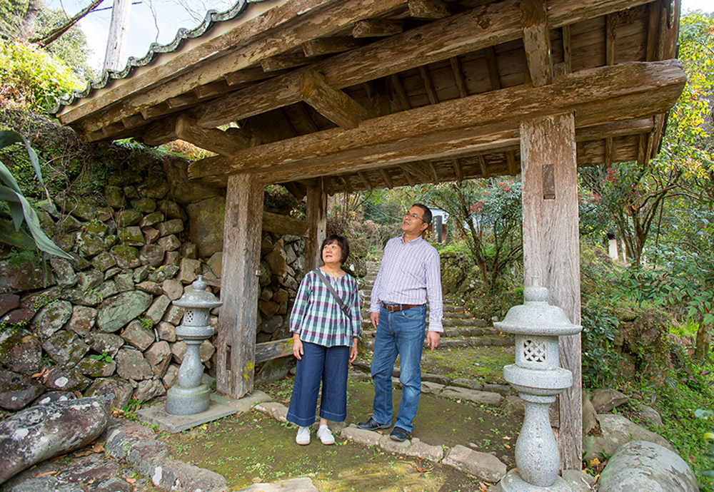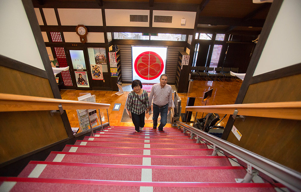 周辺には中岡慎太郎ゆかりの地がたくさんあります。まずは生家から。庄屋の家には必ず勘定の間、庭に面した式台、次の間、客間などがあり、ここには自由に入れます。ふたり並んで縁側に腰かけ、山をのんびり眺めつつ、慎太郎になった気分を味わいます。
