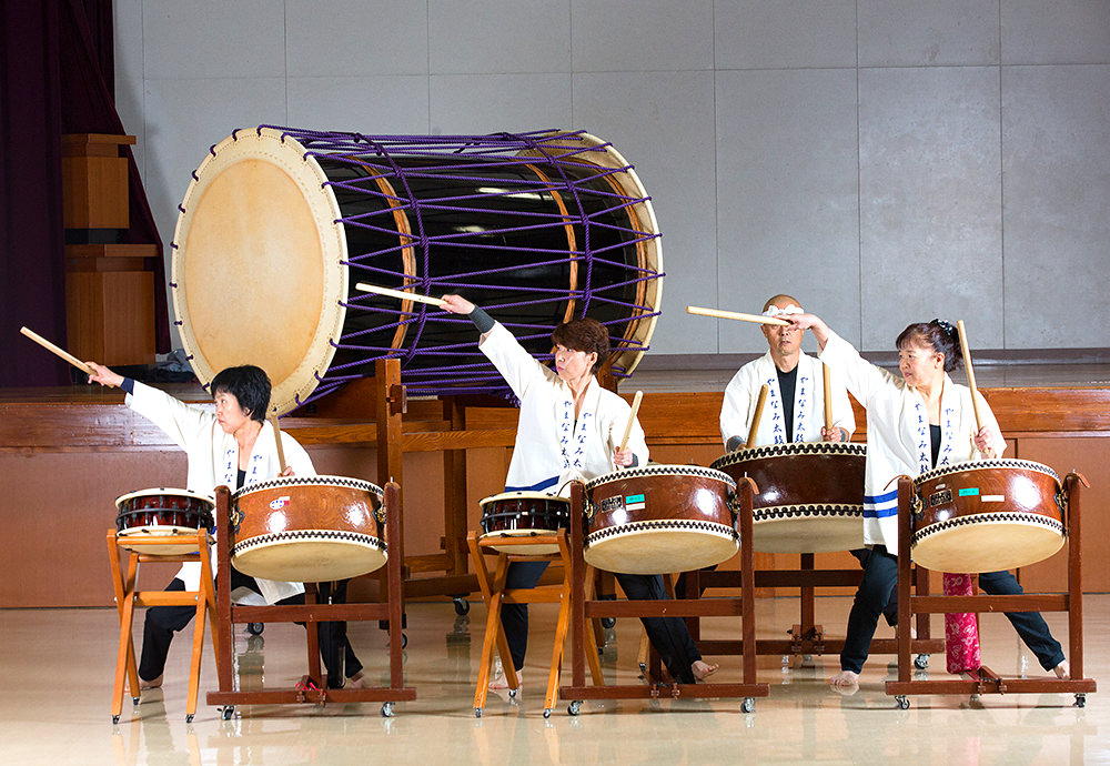 女性メンバーが中心のやまなみ太鼓。それぞれ仕事、家庭がありながらも活動を続けています。「皆の太鼓の音がバッチリ合うと爽快な気分になります。」と女性メンバーのひとり。短い曲でも4分、長い曲は8分ほどあり、ずっとバチで叩くなど体力勝負の一面もあります。太鼓の勇壮で華麗な音、そしてこの活動を次の若い世代へつなげていきたいと宮内さんは考えています。