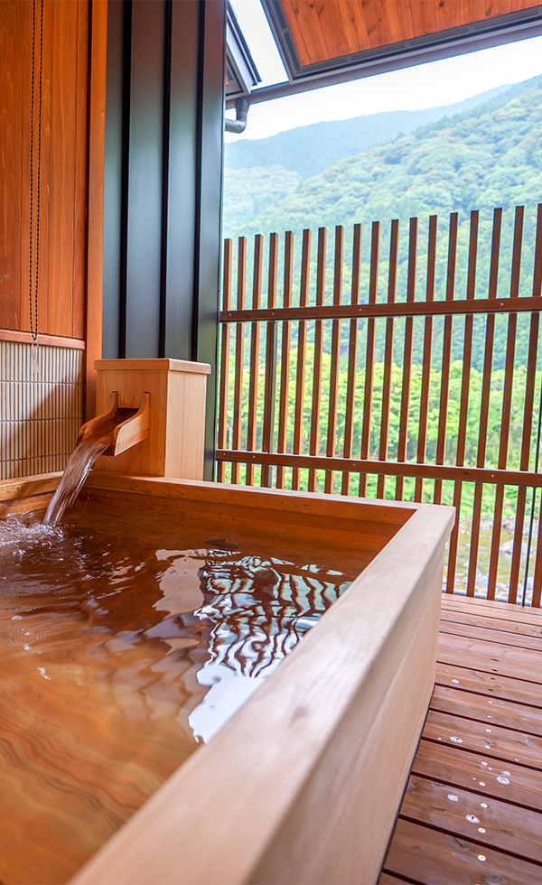 木の温もりを感じる客室は、展望風呂を併設する和洋室タイプ、ツイン、ダブルの3タイプ。大浴場、露天風呂、家族風呂はすべて100%源泉の温泉で、日帰り入浴での利用も可能。宿泊の際の夕食には、四季の野菜など、旬の食材を使用した和会席をご用意。朝食にはほっこり和定食をご準備いたしております。ゆずの郷と呼ばれる北川村で、癒しの時間をたっぷりご用意してお待ちしています。