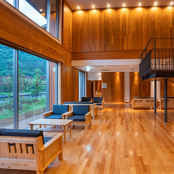 2018年にリニューアルされ、まるで木のアート施設のようなモダンな温泉宿に。国内初のCLT工法で建設された施設には、北川村産材がふんだんに使われています。