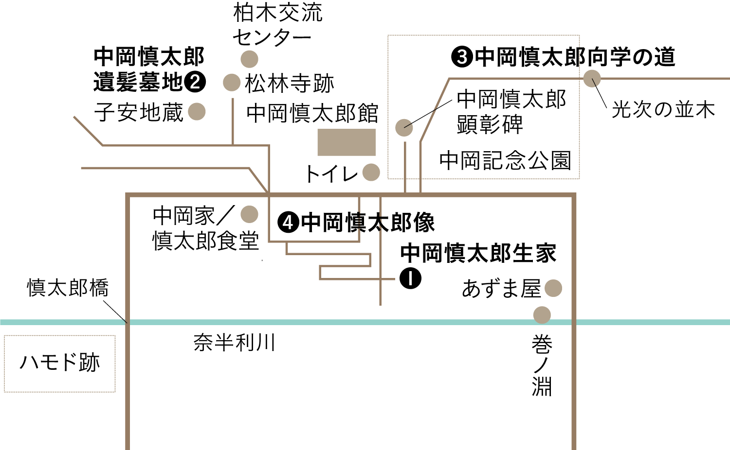 北川村の青年団が慎太郎を知る田中光顕(元宮内大臣、陸援隊隊員)に相談して、昭和2年(1927)に建立した「中岡慎太郎顕彰碑」や、少年時代に川遊びをしていた「巻ノ淵」、向学の道の途中には幼少時代の名前が付けられた「光次の並木」があります。